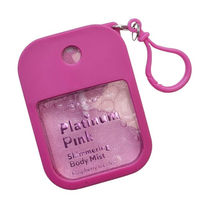 Sence Platinum Pink Shimmering Body Mist, un spray de corp cu sclipici și aromă de zmeură.
