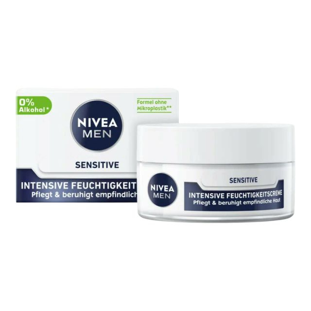 Nivea Men Sensitive Intensive Feuchtigkeitscreme, o cremă hidratantă intensivă creată special pentru bărbații cu piele sensibilă. Aceasta este concepută pentru a oferi o îngrijire delicată, având o formulă cu 0% alcool (fără alcool etilic) pentru a preveni senzația de arsură și iritațiile.