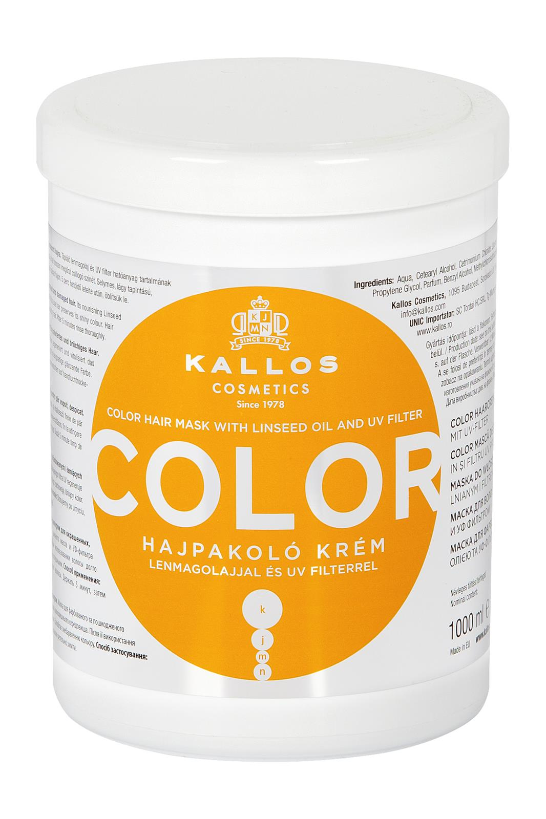 Masca Color Kallos a fost concepută în special pentru menținerea nuanței părului după procesul de vopsire. Compoziția nutritivă are la bază un complex natural de ulei din in, iar elementele auxiliare sunt prezentate sub formă de extracte din grâu și bambus. Produsul deține filtru activ, ce nu permite radiației UV să deterioreze structura părului. De asemenea, masca contine vitamine, săruri minerale și peptide. Datorită componentelor nutritive din compoziția sa, chiar și părul foarte deteriorat își restabilește elasticitatea și strălucirea naturală.
