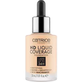 Efect de a doua piele: Fondul de ten HD Liquid Coverage se simte ca o a doua piele și creează un ten catifelat și perfect - pentru până la 24 de ore! Textura ultra-ușoară, lichidă, cu acoperire ridicată, dar cu aspect natural, ascunde imperfecțiunile pielii, este îmbogățită cu niacinamidă care perfecționează pielea și este, de asemenea, impermeabilă, rezistentă la transpirație și transfer. Formula nu conține parabeni sau microplastic.