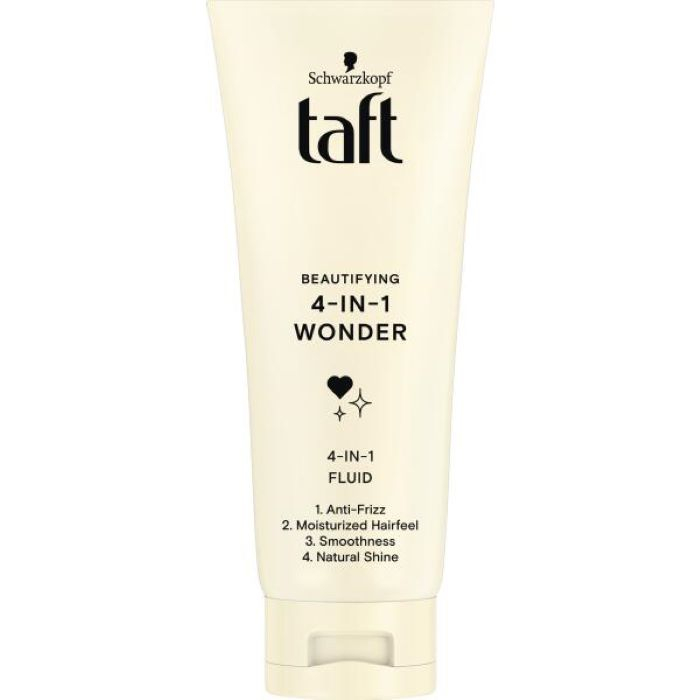 Taft Beautifying 4 in 1 Wonder este un fluid fantastic pentru par care confera parului un aspect spectaculos. Formula inovatoare conţine o combinaţie perfectă de ingrediente care hidratează in profunzime și netezesc firele, oferindu-le in același timp o strălucire uimitoare. Garantează o protecție eficientă impotriva deshidratării excesive pe tot parcursul zilei. Produsul oferă rezultate de lungă durată, astfel incât să vă puteți bucura de o coafură frumoasă ore intregi,nu lasă reziduuri vizibile şi nici nu ingreunează părul.Pentru toate tipurile de par.Formula vegana.