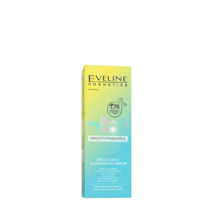 Serul inovator cu efect de netezire My Beauty Elixir Smooth Pineaple, constituie un remediu perfect pentru îngrijirea și hidratarea tuturor tipurilor de piele. Formula sa activă consolidează starea generală a epidermei, regenerează zonele afectate și accelerează metabolismul celular. După aplicare, tenul capătă un aspect neted, moale și catifelat. Compoziția nutritivă restabilește elasticitatea și fermitatea țesuturilor. Produsul cosmetic reflectă o strălucire naturală, iluminează și menține nivelul optim de apa în celule. Serul uniformizează culoarea feței, reduce vizibilitatea petelor pigmentare și o pregătește pentru următoarea etapă de îngrijire.
