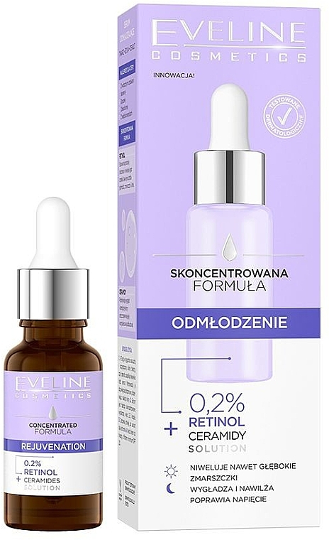 Serul de intinerire este o formula puternica, concentrata, de ingrediente perfect regenerante si anti-imbatranire.Serul va asigura hidratarea optima a pielii, necesara unei bune functionari. Soluție de retinol 0,2% - reduce vizibilitatea ridurilor, netezește liniile fine și asigură regenerarea, ceramidele oferă o hrănire excepțională și îmbunătățesc aspectul pielii. Serul va elimina imperfecțiunile și va întări și întineri pielea.