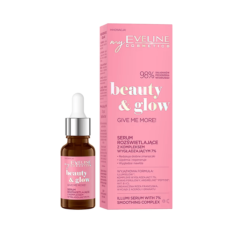 Beauty & Glow Give Me More! este un ser facial de iluminare și netezire conceput pentru iluminarea și uniformizarea tonului pielii. Produsul conține un complex special de ingrediente care asigură un efect de botox. Luminează intensiv pielea, combate ridurile, aspectul tern, pierderea fermității. Datorită ingredientelor active speciale, serul susține microbiomul unic, oferind pielii un aspect sănătos și o strălucire naturală. Acidul ferulic, argyrelin, vitaminele B și C - netezesc și întăresc pielea, previn pierderea fermității, extractele de acerola și de rodie - îmbunătățesc densitatea epidermei, încetinesc procesele de îmbătrânire, oferă protecție antioxidantă, extractul de trandafir franțuzesc bio - asigură un efect hidratant intens, iar complexul de pre și probiotice - întărește microbiomul unic al pielii.