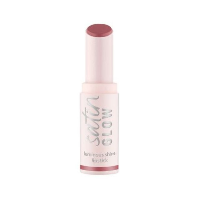 Essence satin GLOW luminous shine lipstick 03 Rose And Shine, într-o nuanță de lemn de trandafir, foarte pigmentat, oferă o culoare intensă dintr-o singură aplicare, în timp ce textura cremoasă și delicată alunecă fără efort și se simte ultra-confortabil pe buze.