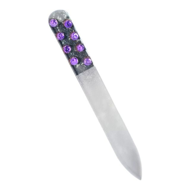 Pilă de unghii din sticlă, model mini, în husă de protecție. Pila are un design transparent, fiind decorată în partea superioară cu mici cristale de culoare mov (rhinestones).